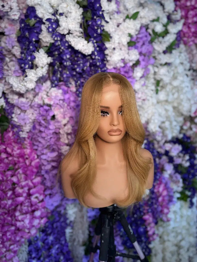 The Bailey glueless 5x5 closure wig features an all-over blonde shade with a sophisticated shadow root and a sleek middle part. Its soft curls add gentle volume and movement, offering a natural, elegant look without the need for adhesive. Perfect for effortless styling and comfortable wear.