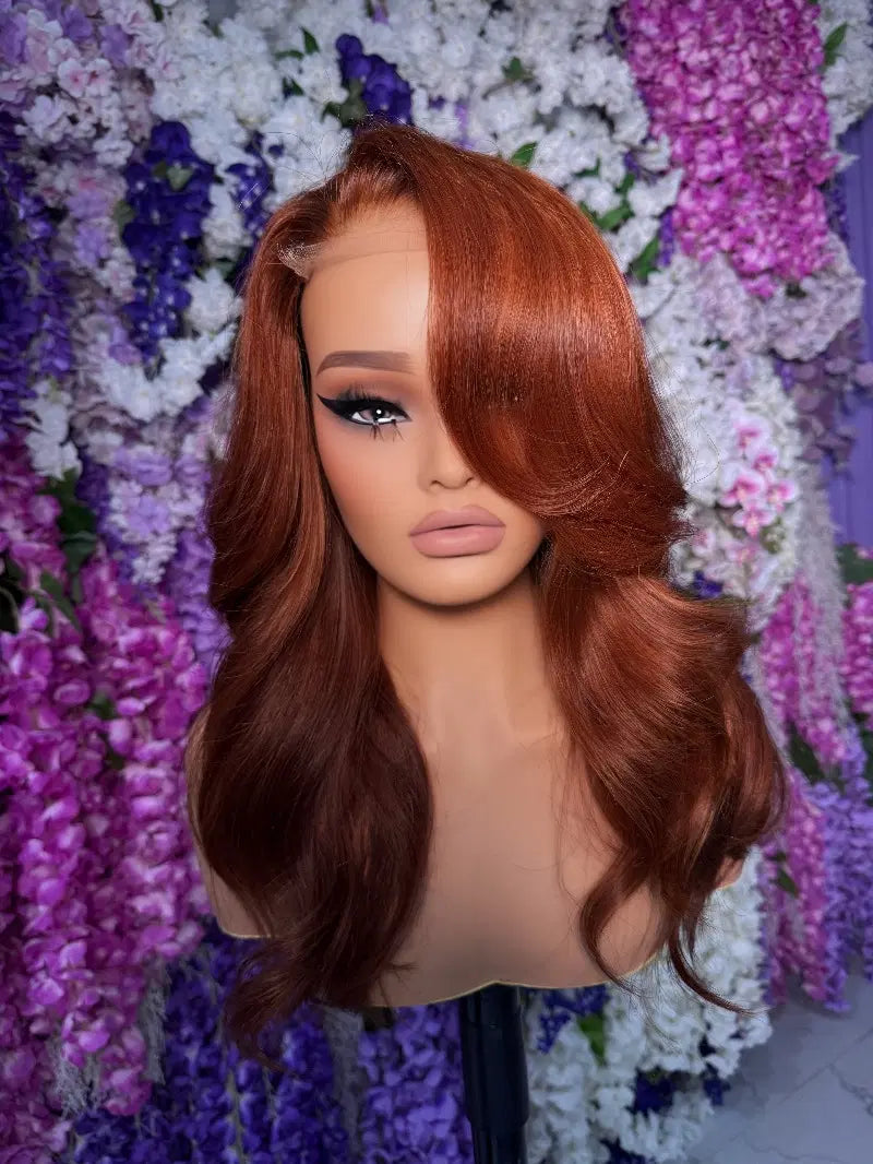 The Keke wig features a 16" length with a 5x5 closure, delivering natural scalp appearance and easy styling. Its soft curls and body wave texture in a radiant copper color create elegant movement, perfect for a sophisticated flip-over look. Enjoy versatile, effortless beauty that enhances your style with rich autumn warmth.